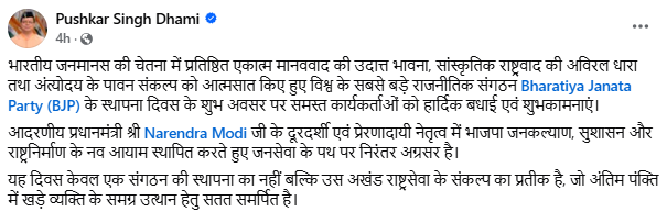 भाजपा के 47 वें स्थापना दिवस पर उत्तराखंड के मुख्यमंत्री पुष्कर सिंह धामी नें भी अपने फेसबुक हैंडल के माध्यम से भाजपा के समस्त कार्यकर्ताओं को हार्दिक बधाई एवं शुभकामनाएं दीं। मुख्यमंत्री धामी ने लिखा कि ” भारतीय जनमानस की चेतना में प्रतिष्ठित एकात्म मानववाद की उदात्त भावना, सांस्कृतिक राष्ट्रवाद की अविरल धारा तथा अंत्योदय के पावन संकल्प को आत्मसात किए हुए विश्व के सबसे बड़े राजनीतिक संगठन Bhartiya Janata Party (BJP) के स्थापना दिवस के शुभ अवसर पर समस्त कार्यकर्ताओं को हार्दिक बधाई एवं शुभकामनाएं। आदरणीय प्रधानमंत्री श्री Narendra Modi जी के दूरदर्शी एवं प्रेरणादायी नेतृत्व में भाजपा जनकल्याण, सुशासन और राष्ट्रनिर्माण के नव आयाम स्थापित करते हुए जनसेवा के पथ पर निरंतर अग्रसर है। यह दिवस केवल एक संगठन की स्थापना का नहीं बल्कि उस अखंड राष्ट्रसेवा के संकल्प का प्रतीक है, जो अंतिम पंक्ति में खड़े व्यक्ति के समग्र उत्थान हेतु सतत समर्पित है।”